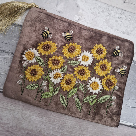 Maple Brown Velvet Pouch with Embroidered Sunflower Field & Bees