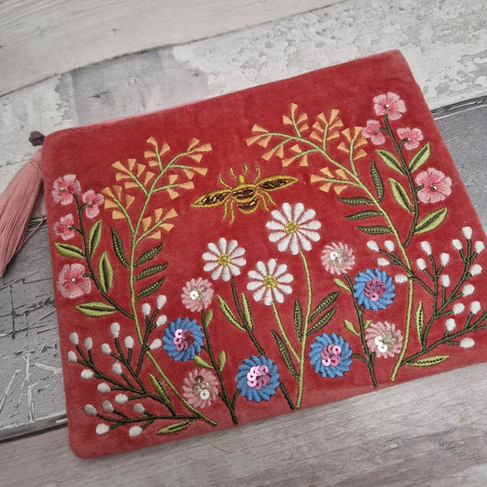 Rich Coral Velvet Pouch with Embroidered Golden Bee