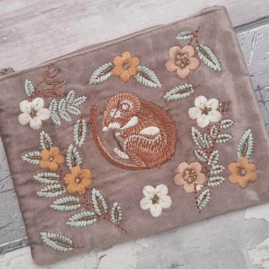 Buff Velvet Cosmetic pouch with embroidered Sleeping Dormouse