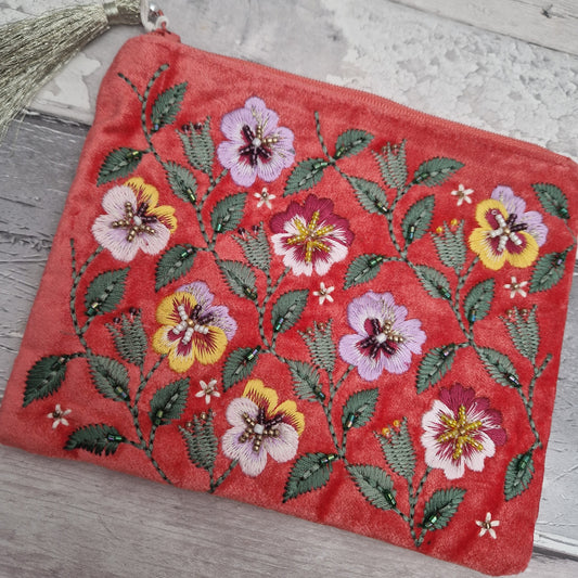 Sunset Salmon Velvet Pouch with Embroidered Pansy