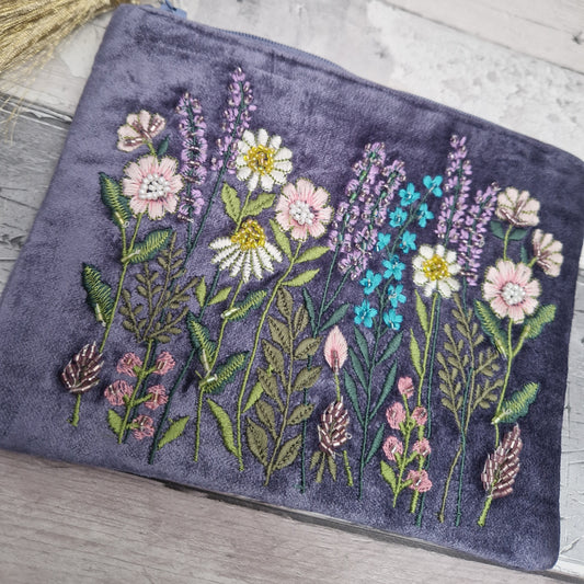 Soft Amethyst Purple Velvet Pouch with Embroidered Garden Flowers