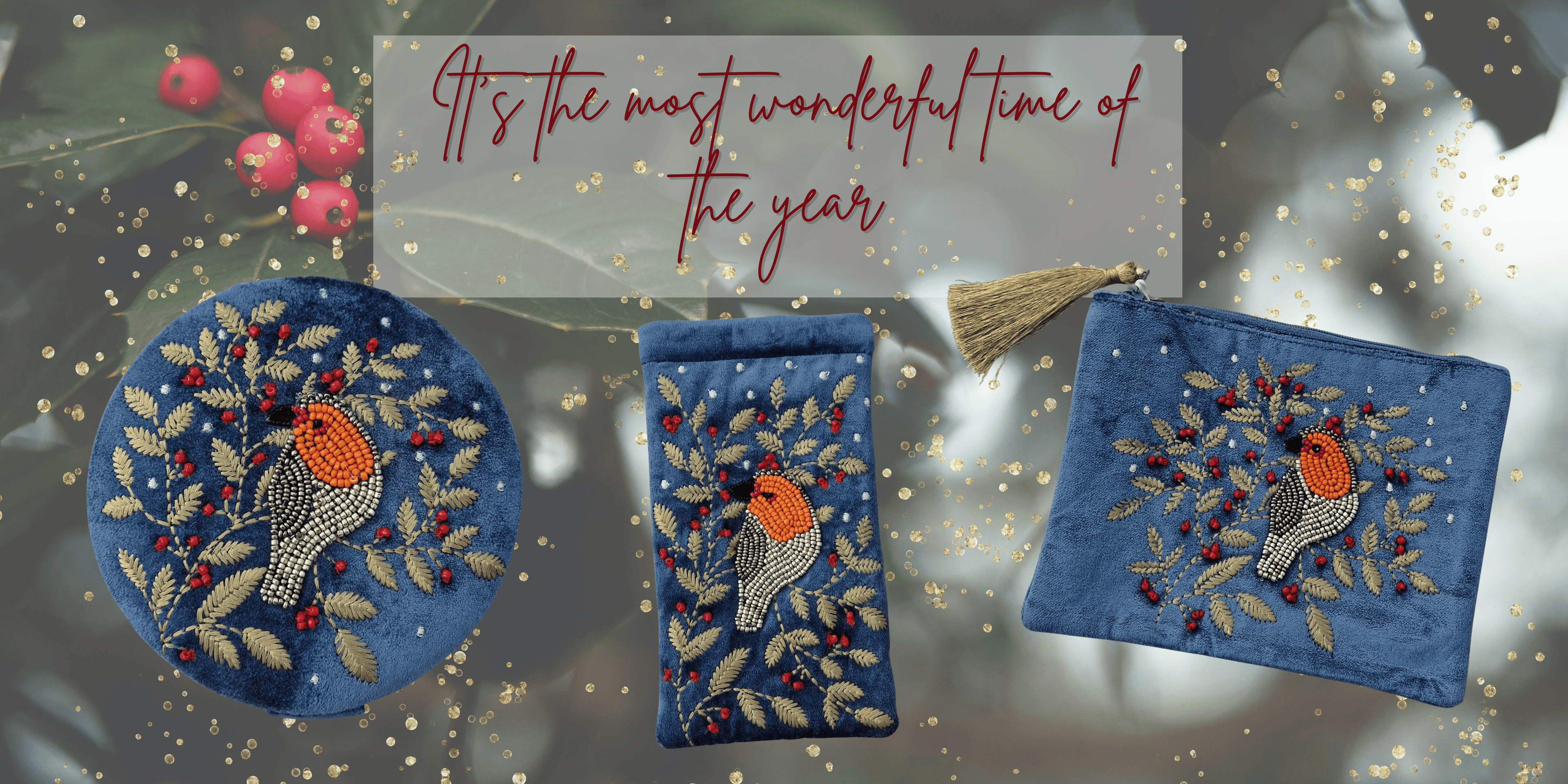 Dusky Blue Velvet Glasses Case / Phone Pouch with Robin and Holly Design