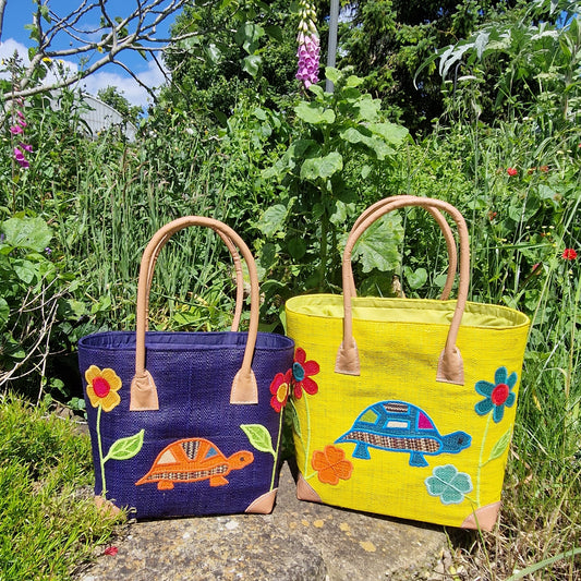 Raffia Baskets decorated with a Tortoise in Yellow or Blue