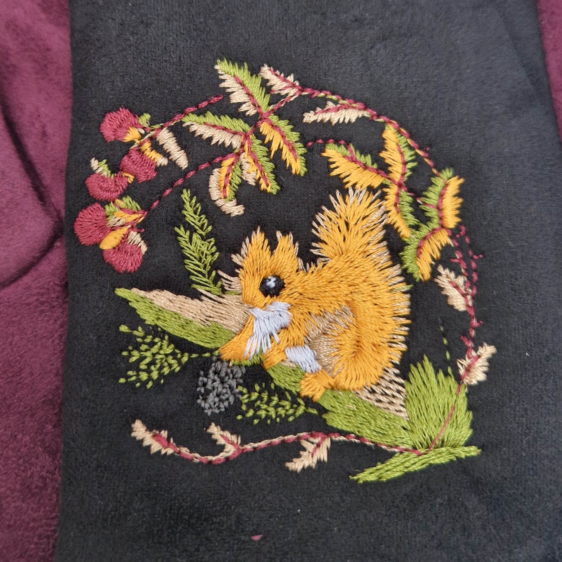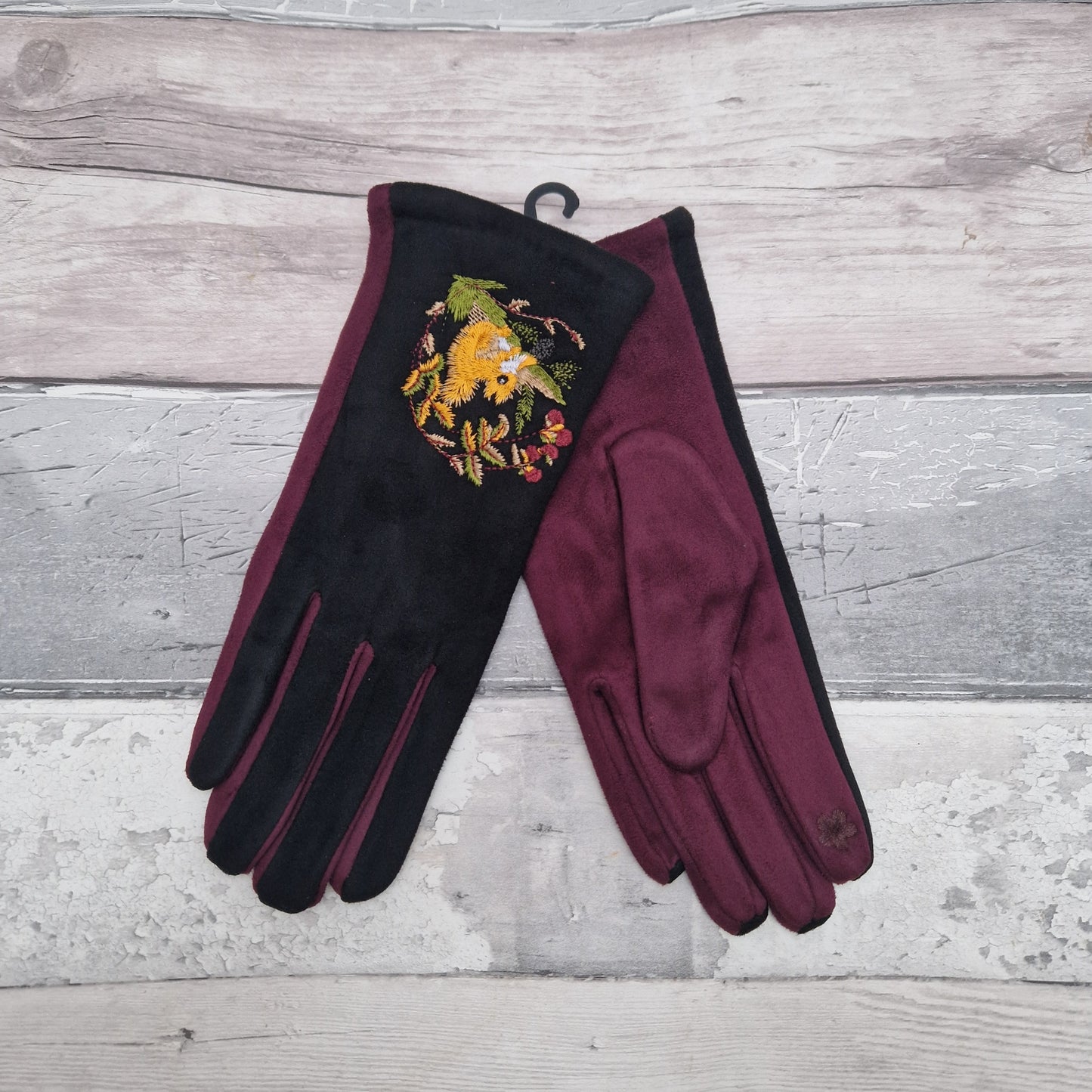 Stay warm and stylish with these black and burgundy gloves adorned with an embroidered red squirrel motif.