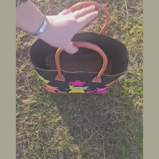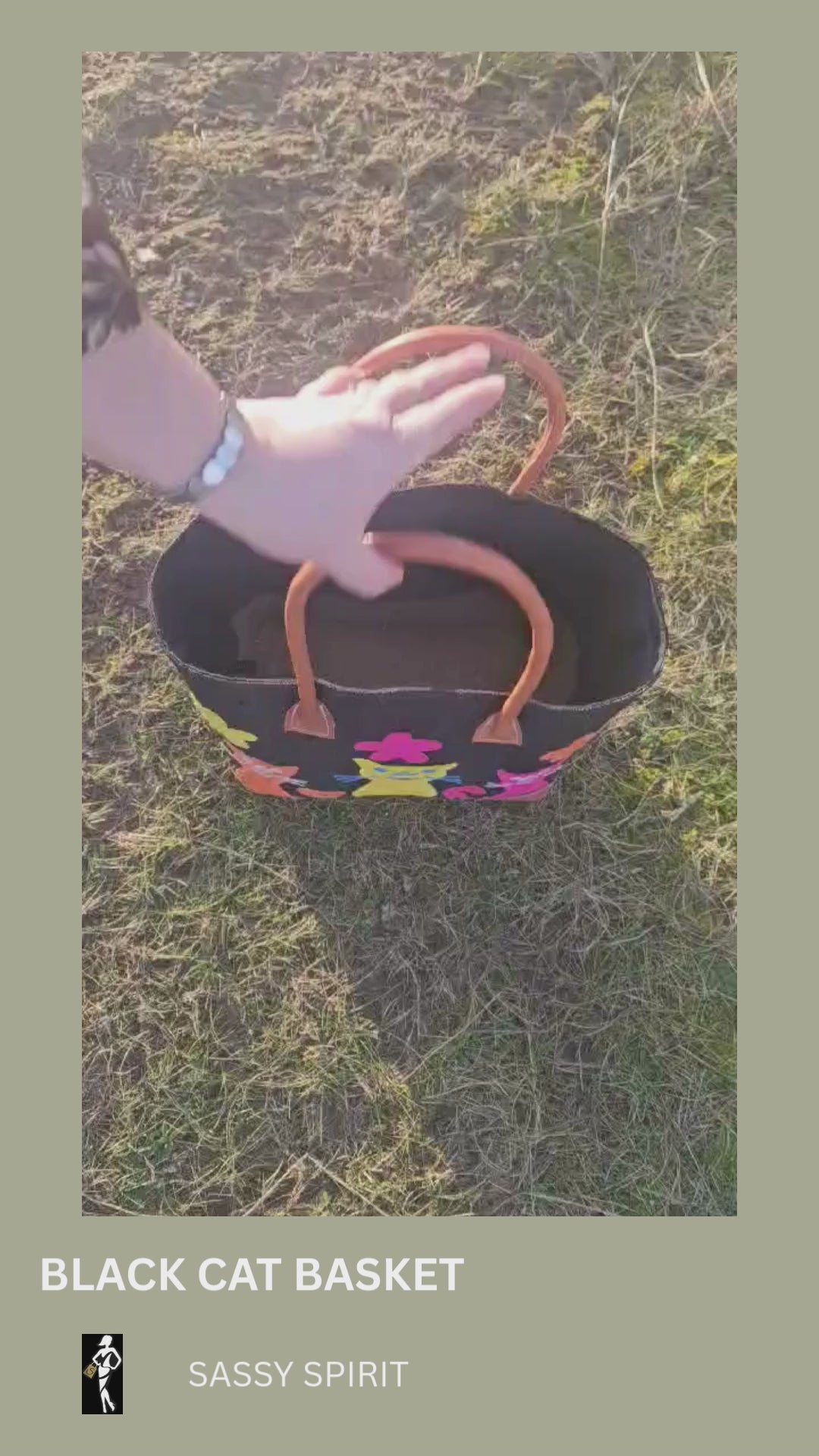These baskets have a black raffia exterior and are decorated with multi-coloured cats*.