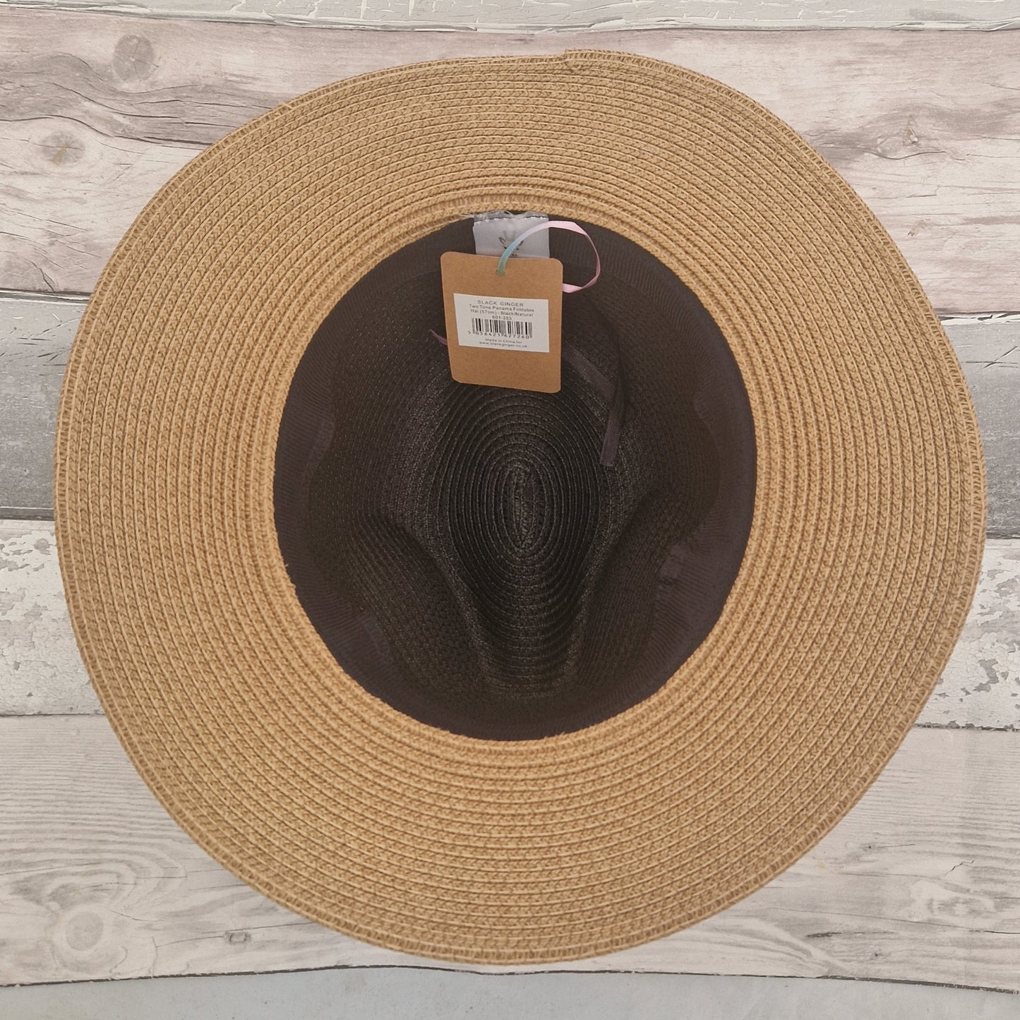 Ladies Panama Fold Away Hat with Leopard print belted band in black and beige