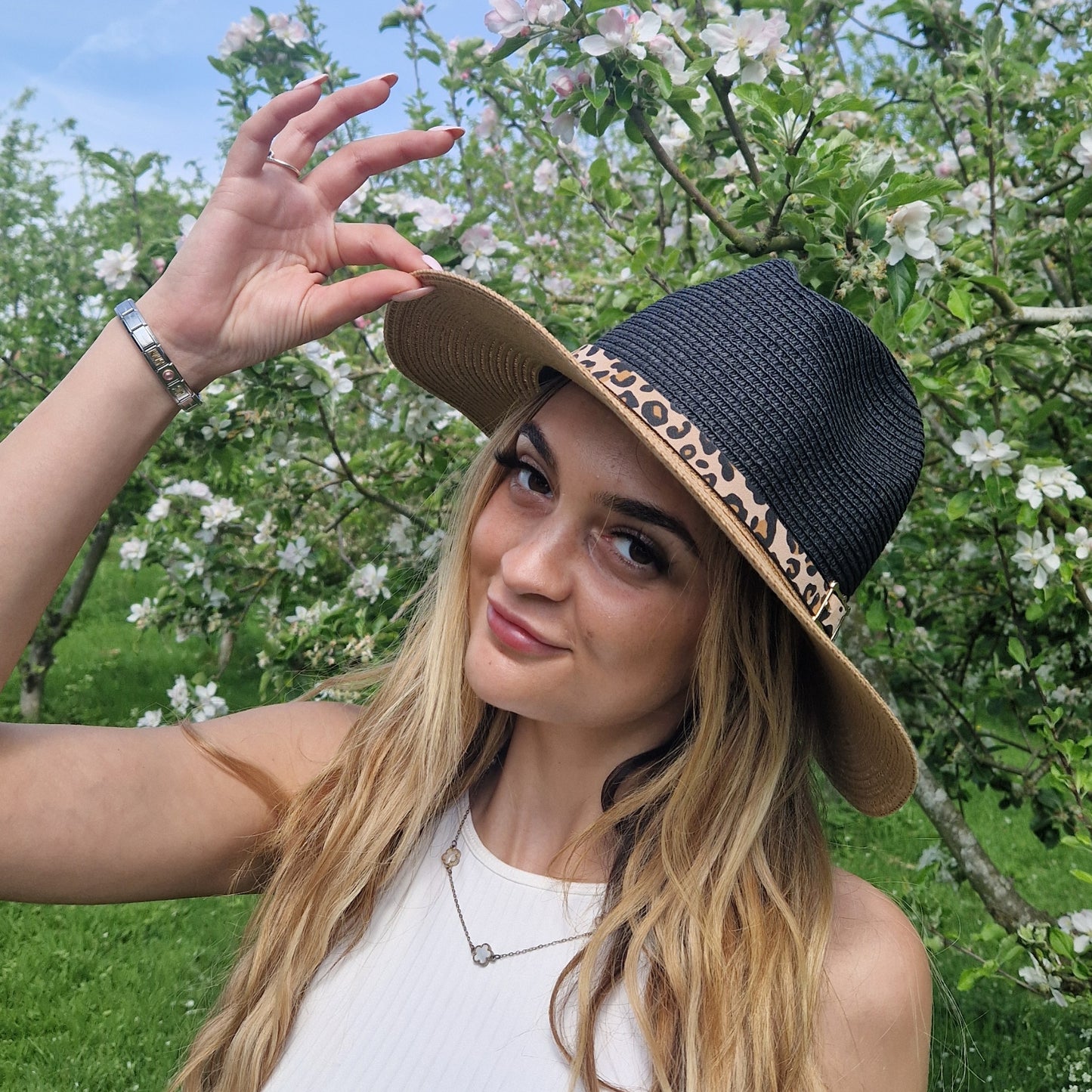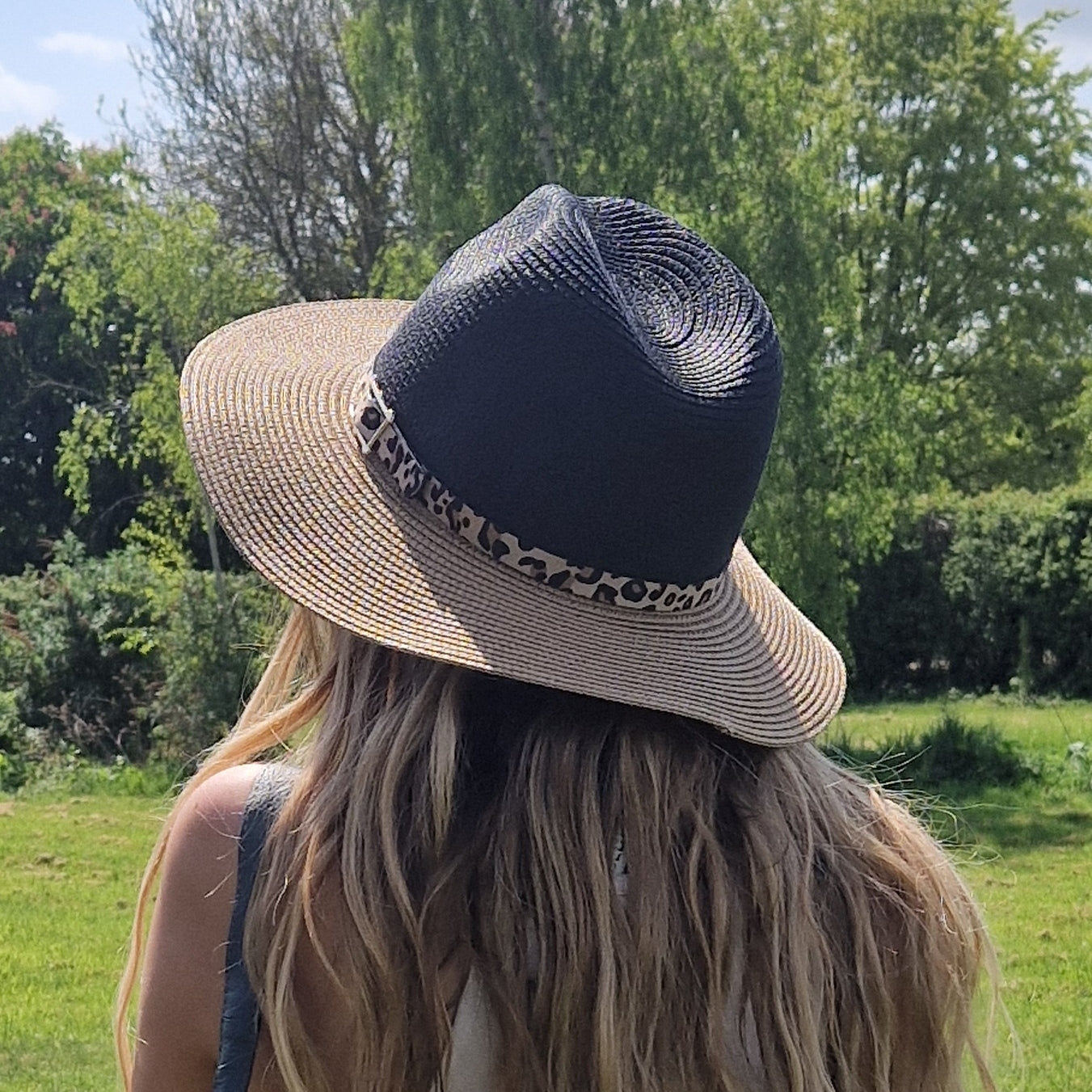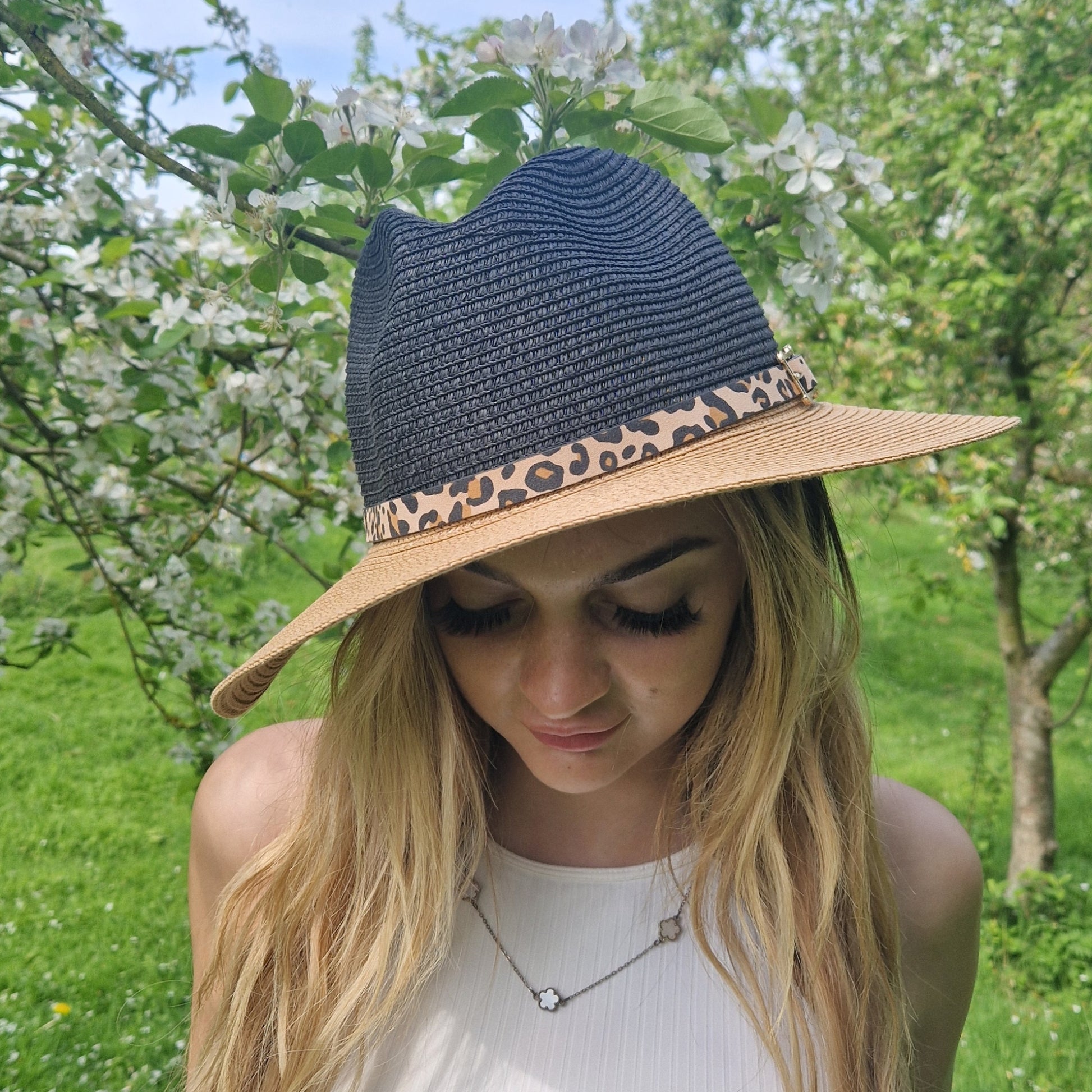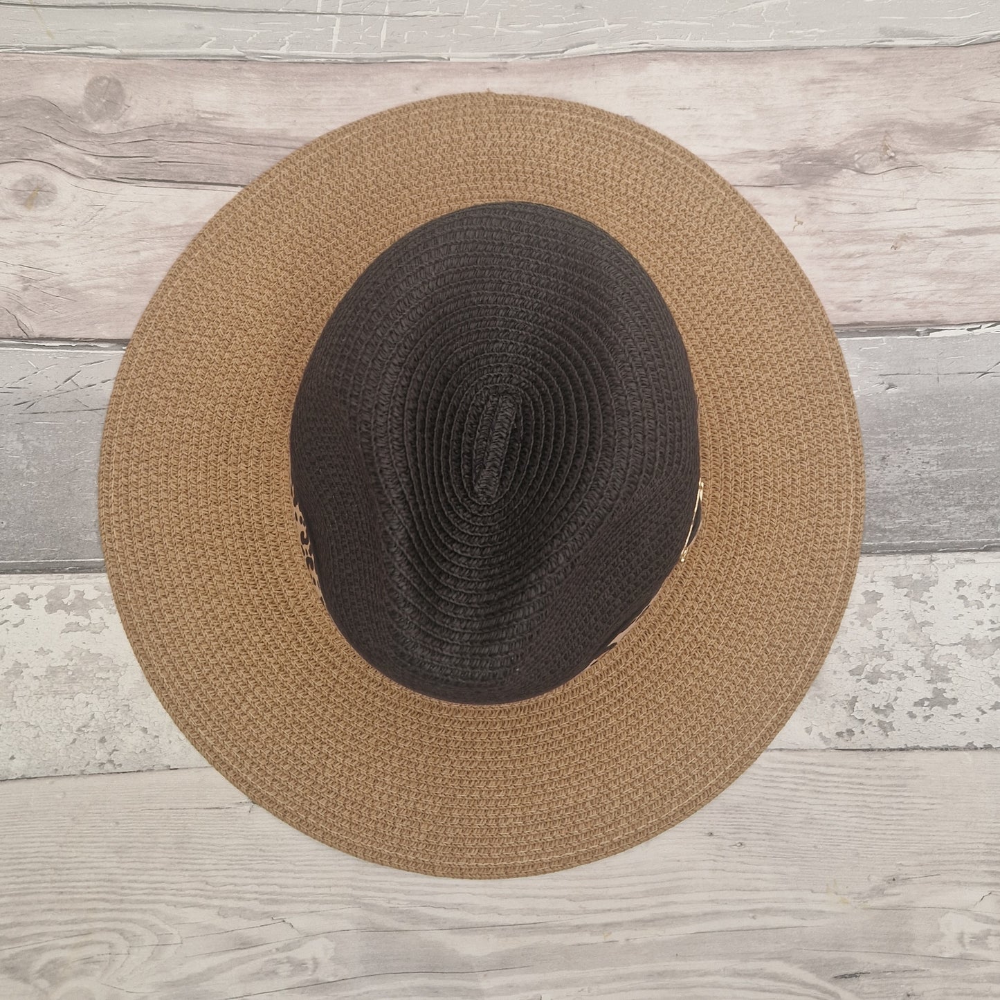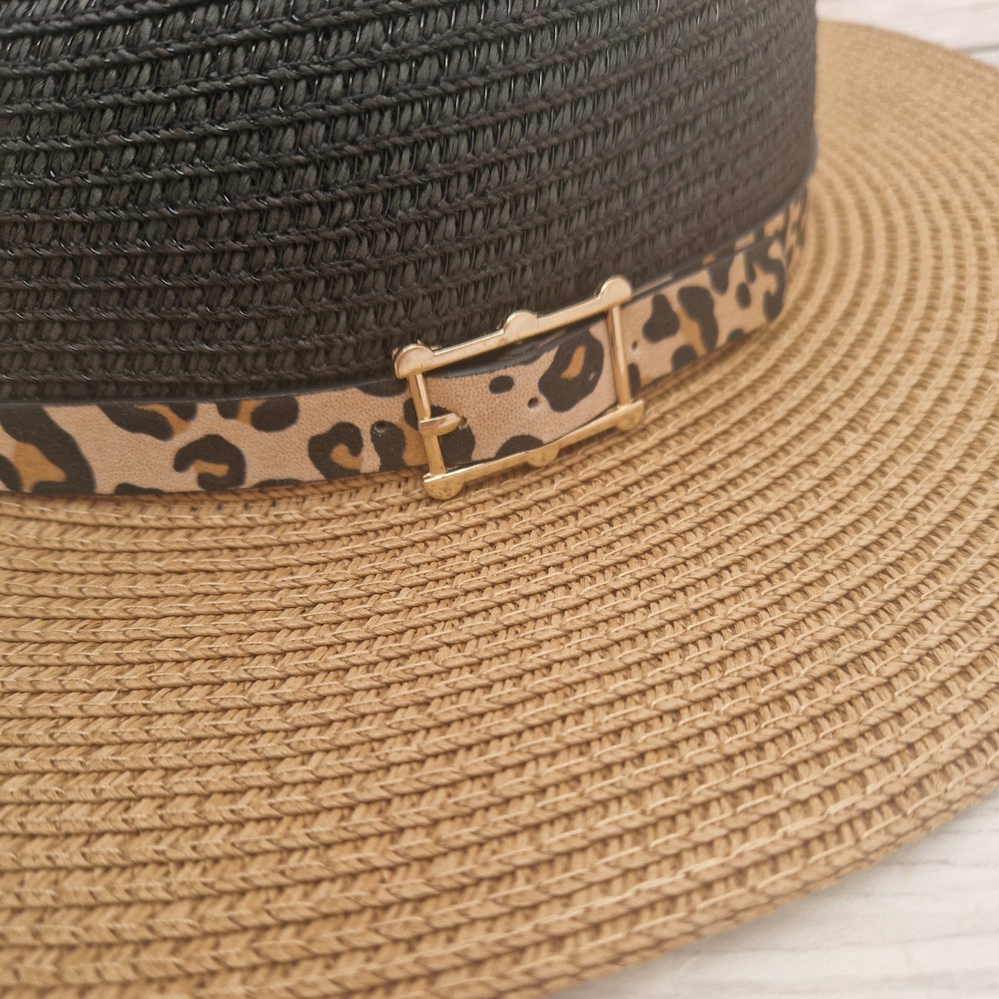 This classic Panama hat has a black top and a brim of beige. The hat is finished with a leopard print belted band.