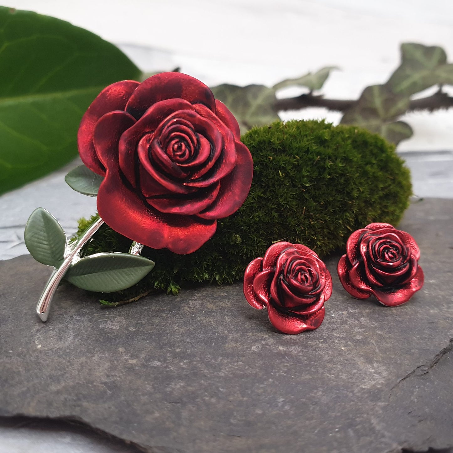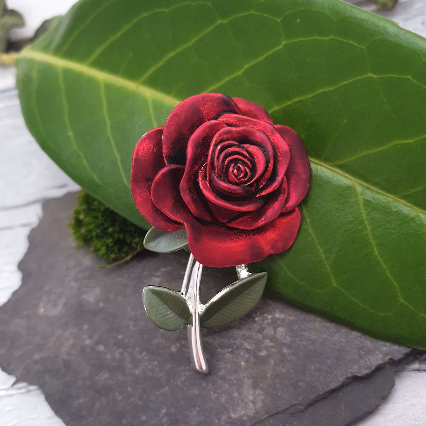 Hand painted in an enamel finish the rich red of the rose petals contrasts with the dark green of the leaf and the silver stem.