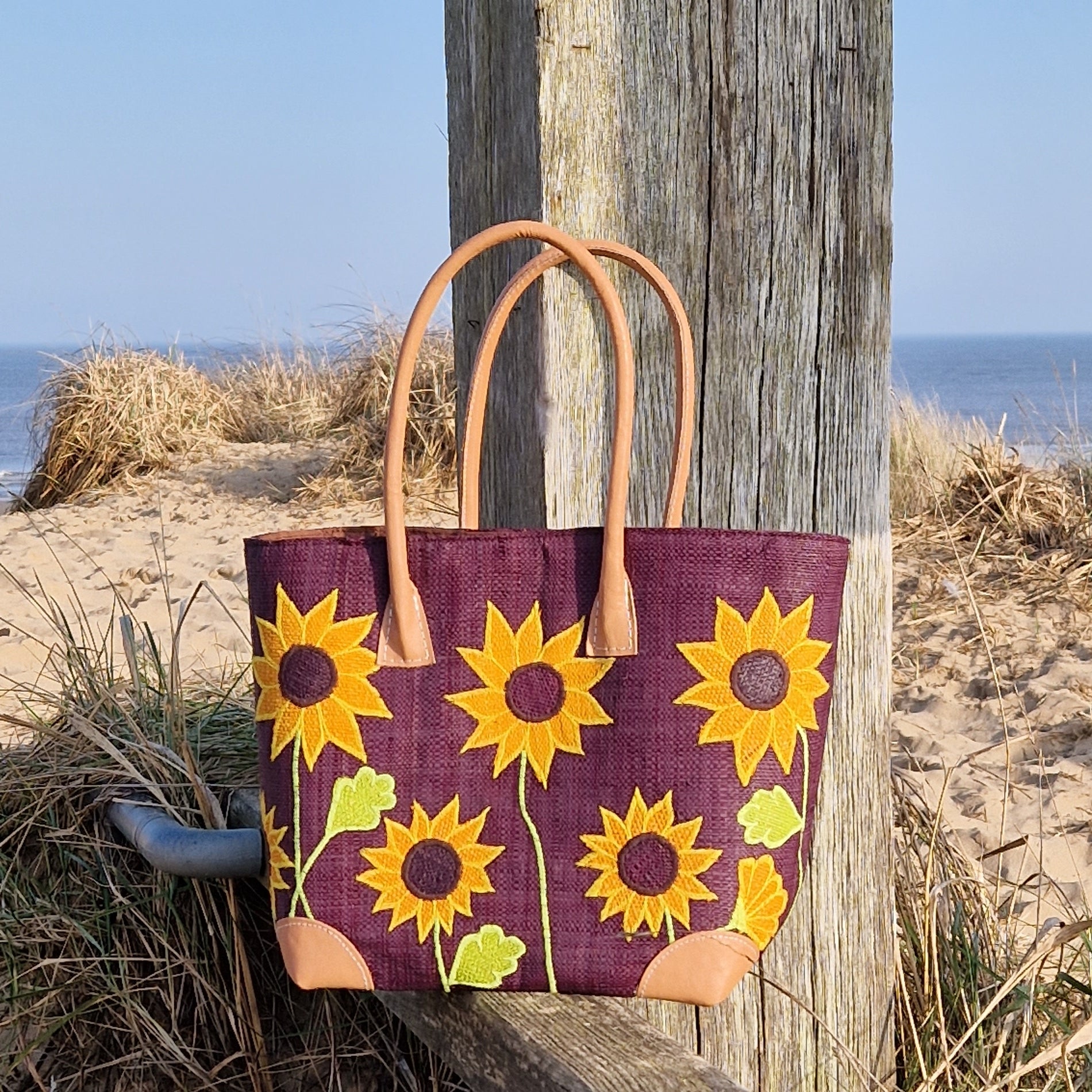 Ces paniers ont un extérieur en raphia marron foncé et sont décorés de superbes tournesols en pleine floraison sur le devant et le dos.