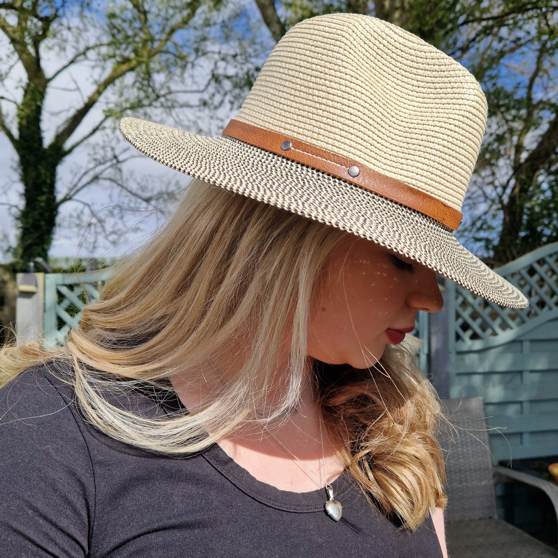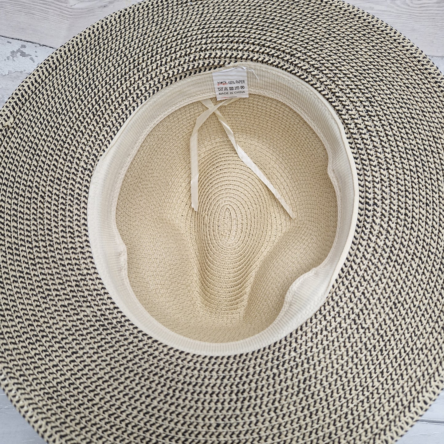 Ce chapeau panama classique est doté d'un haut couleur crème et d'un bord entrelacé noir et blanc qui lui donne un aspect gris. Le chapeau est doté d'une ceinture de couleur beige.