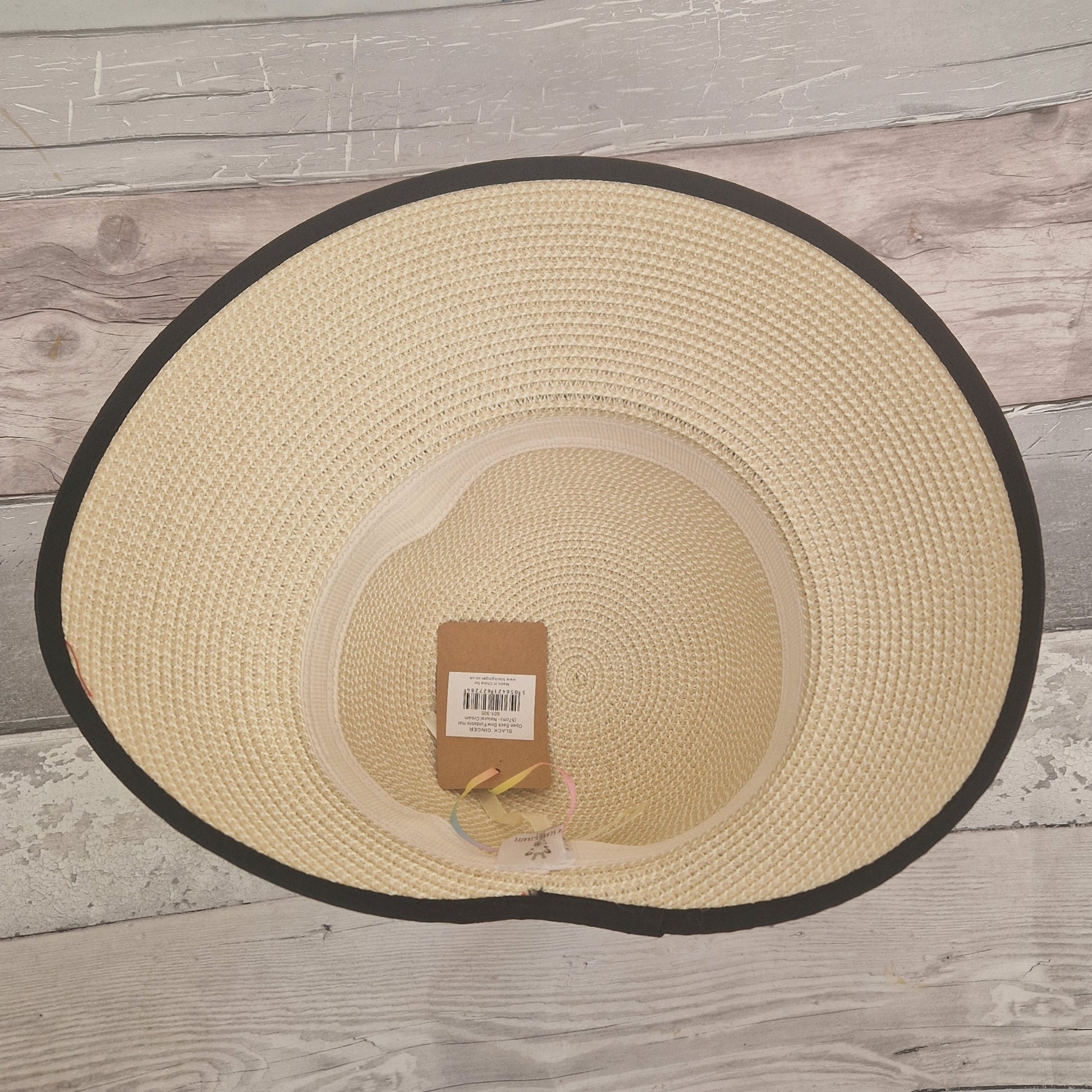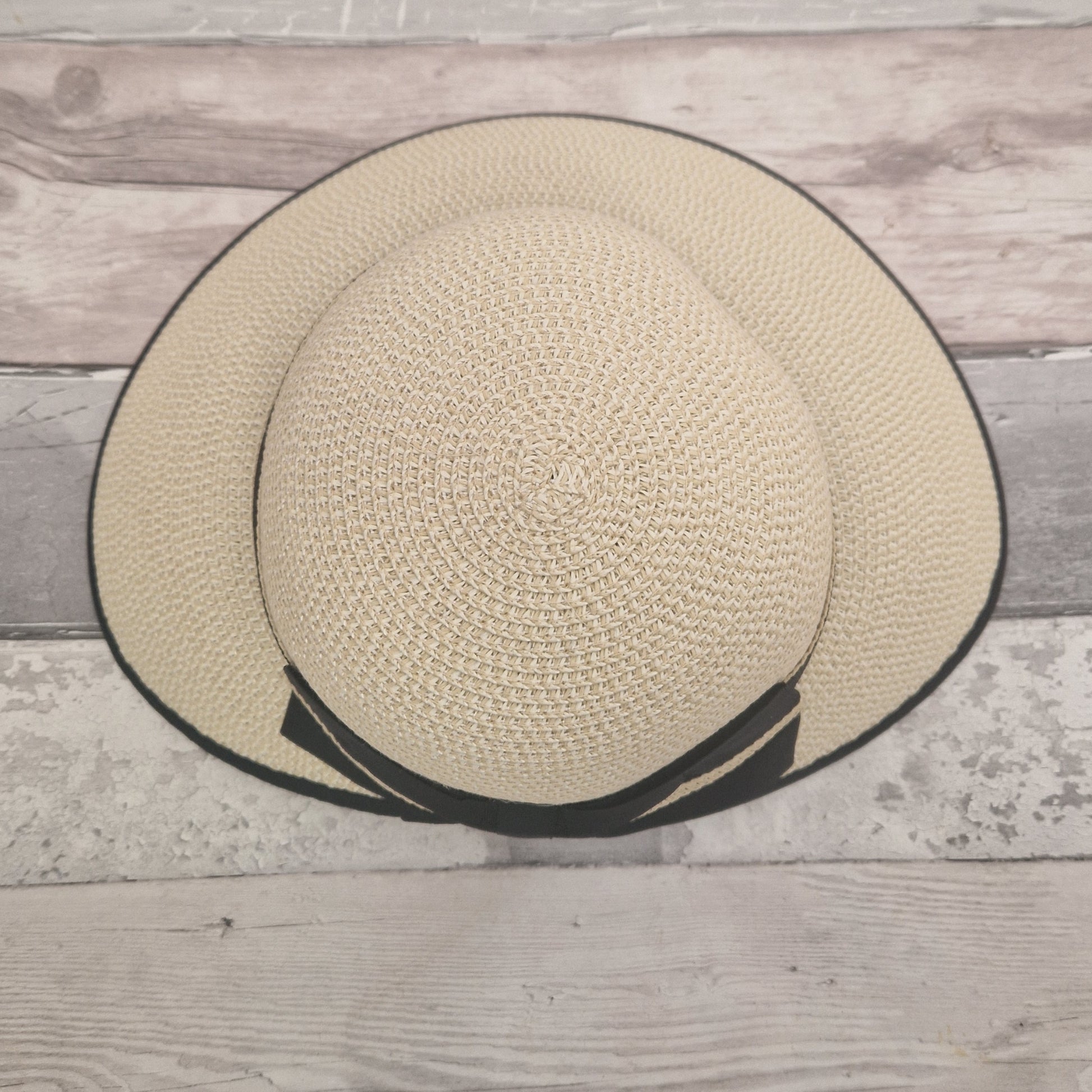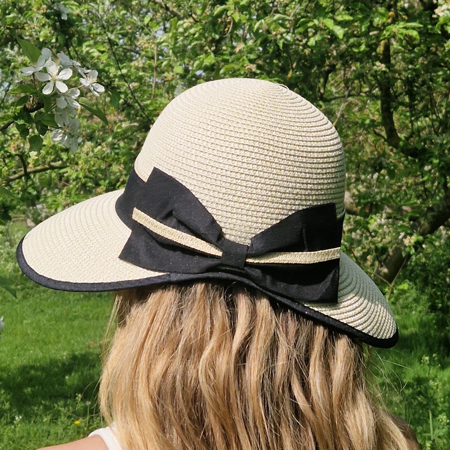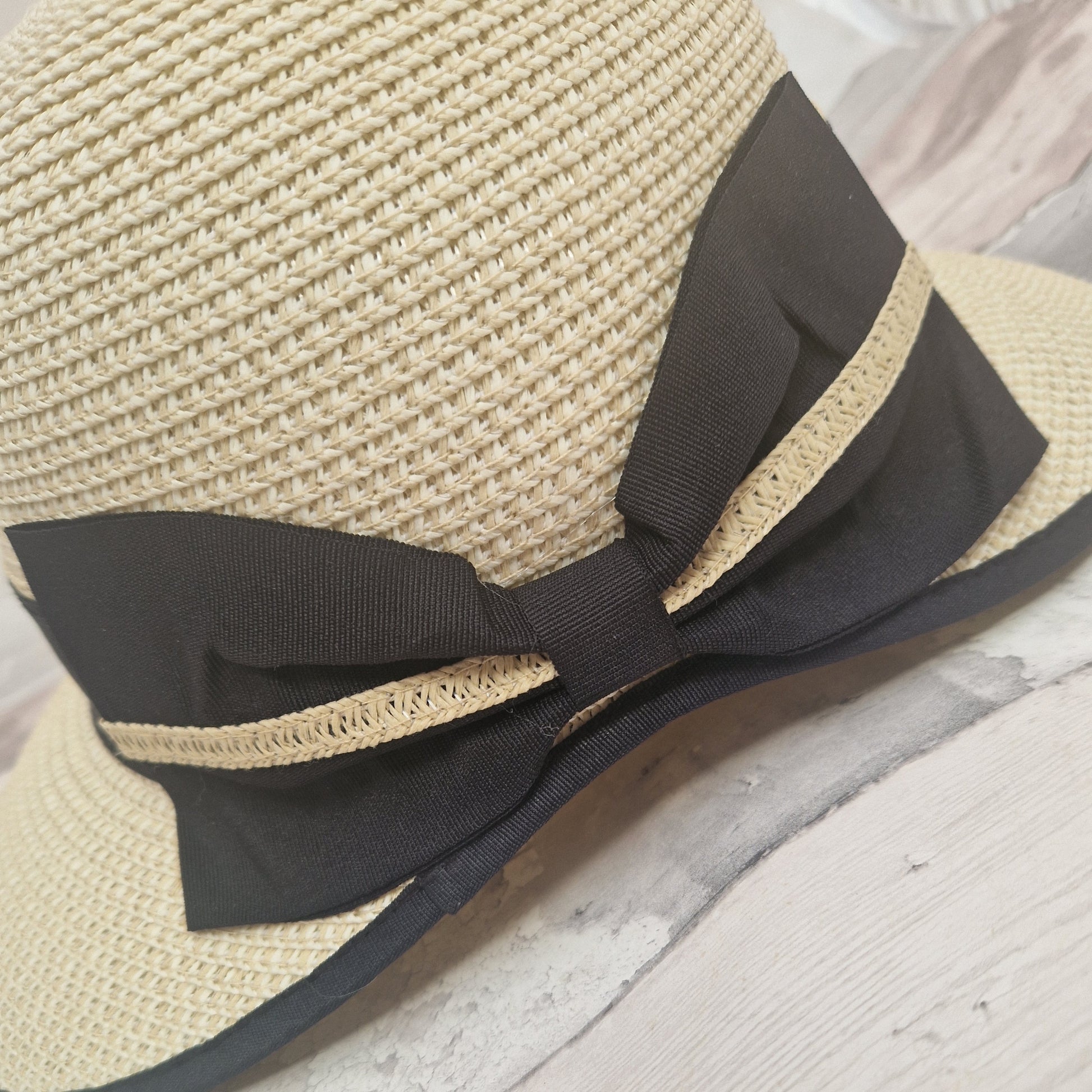 This hat comes in both a lovely rich cream colour or a warm biscuit beige. Both colours are finished with a black trim and stylish black bow at the back.
