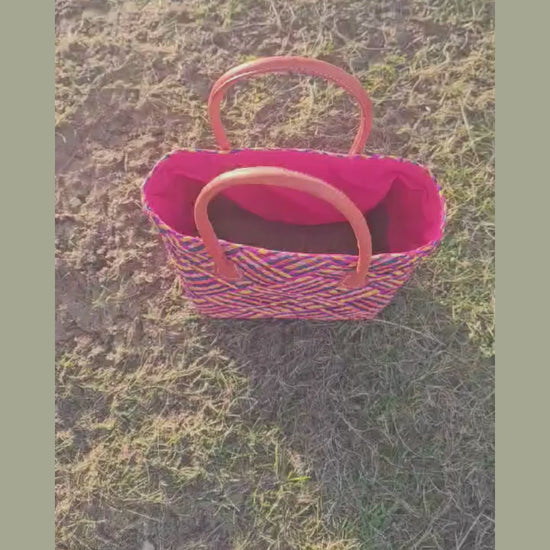 These baskets have a raffia exterior and are decorated in a multitude of colours in a patchwork pattern.