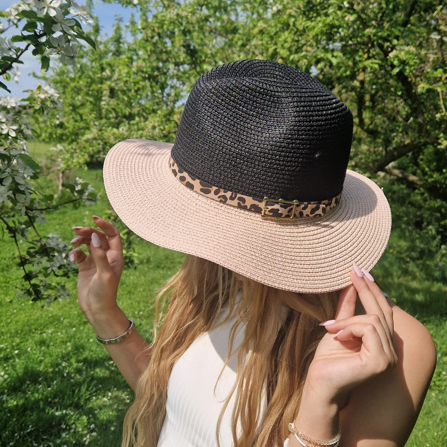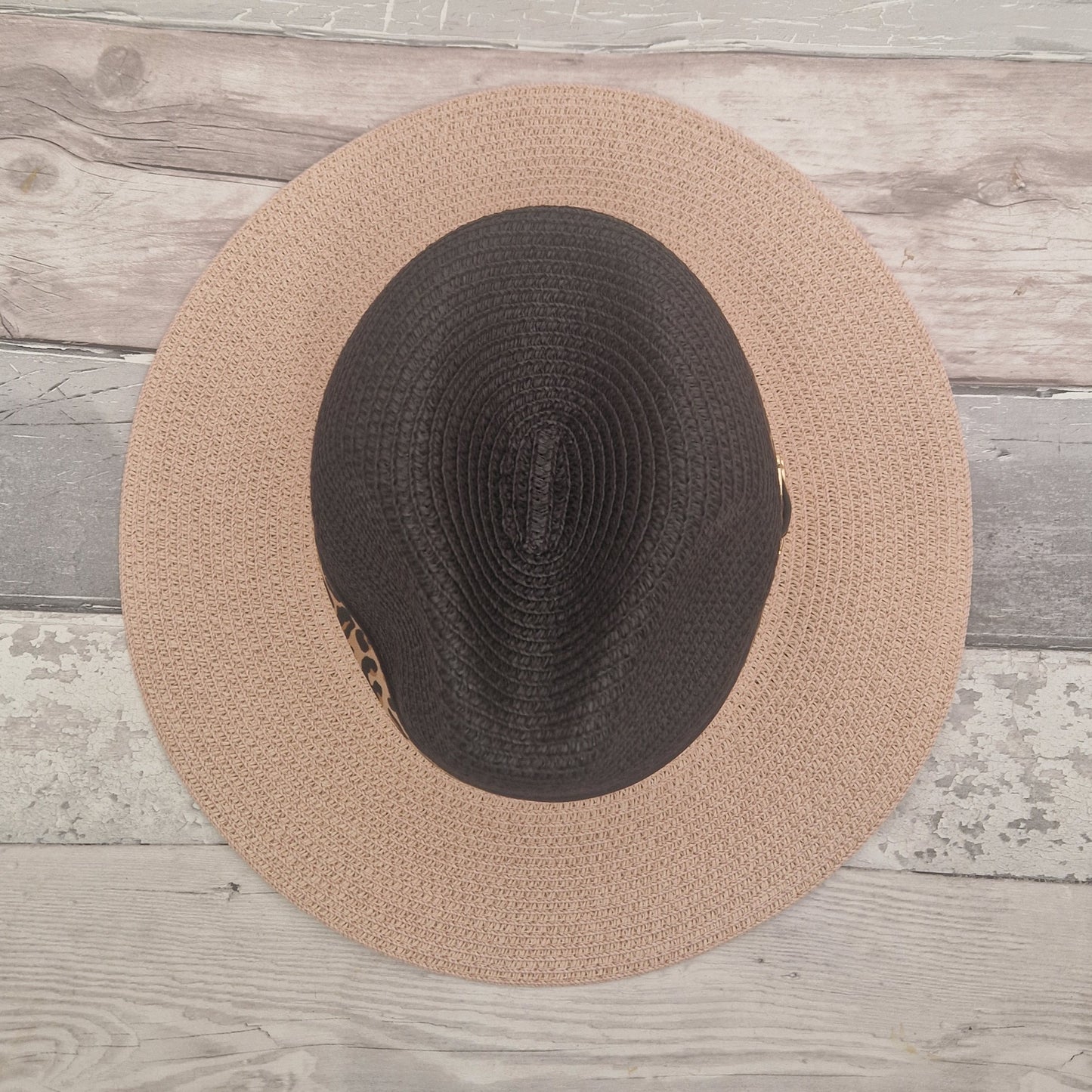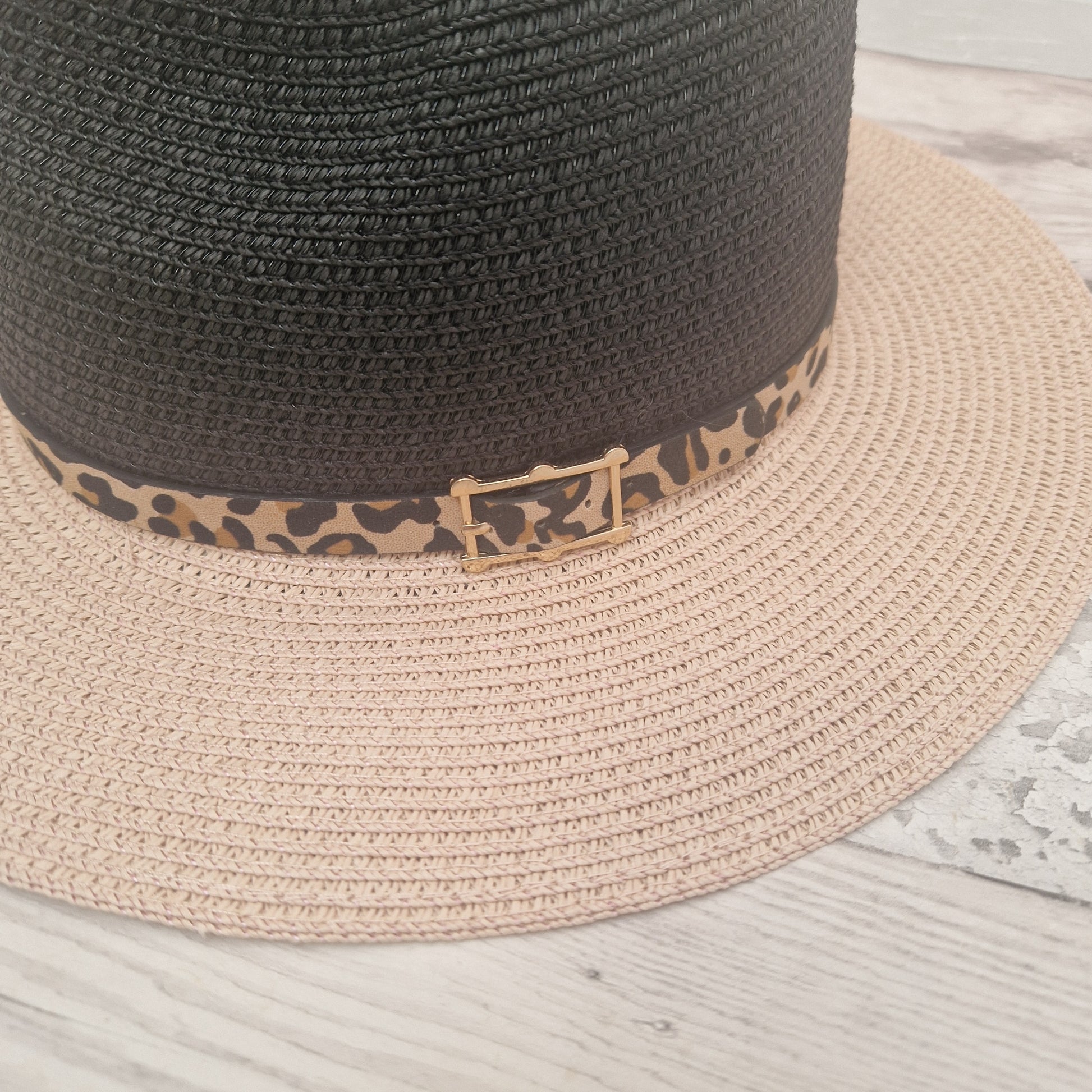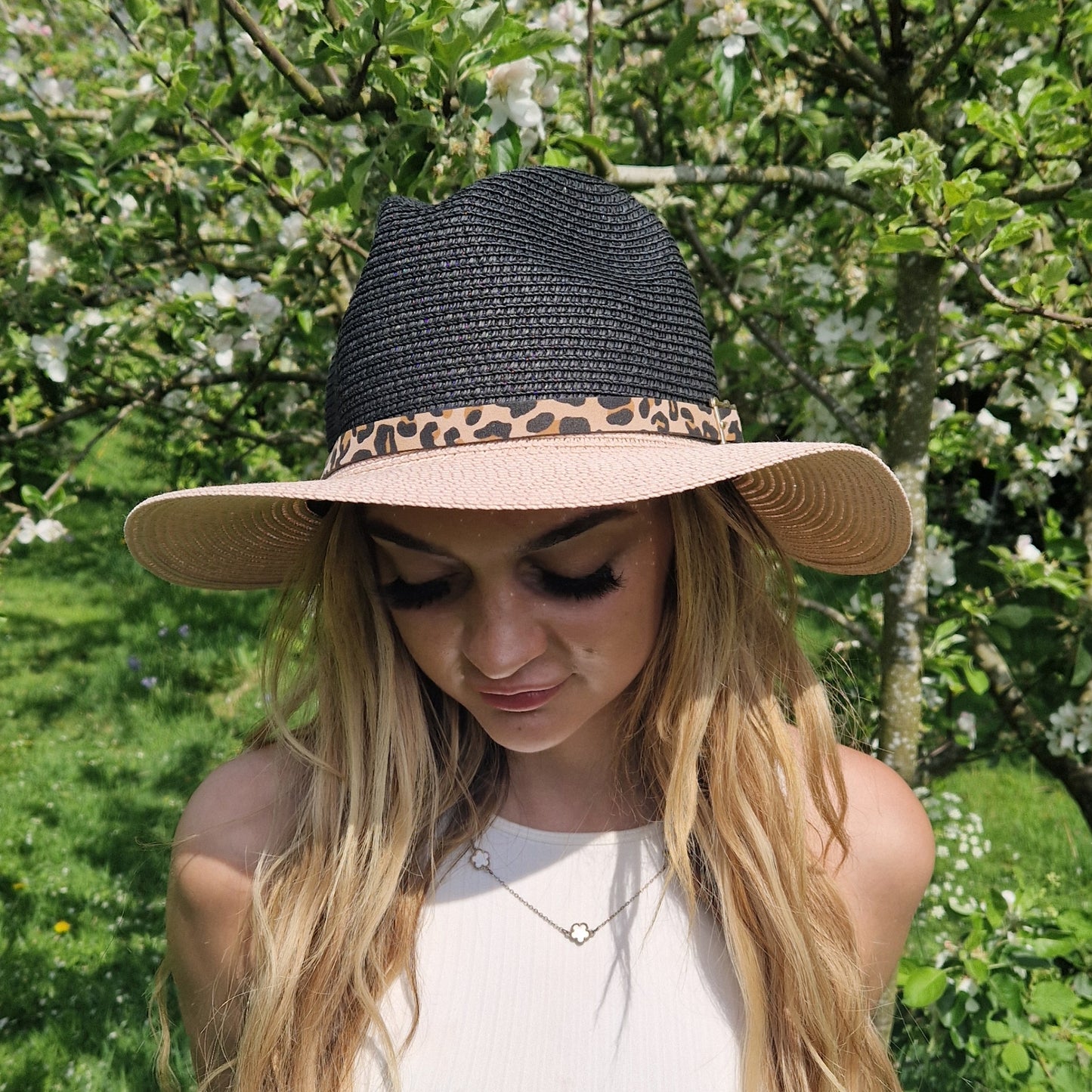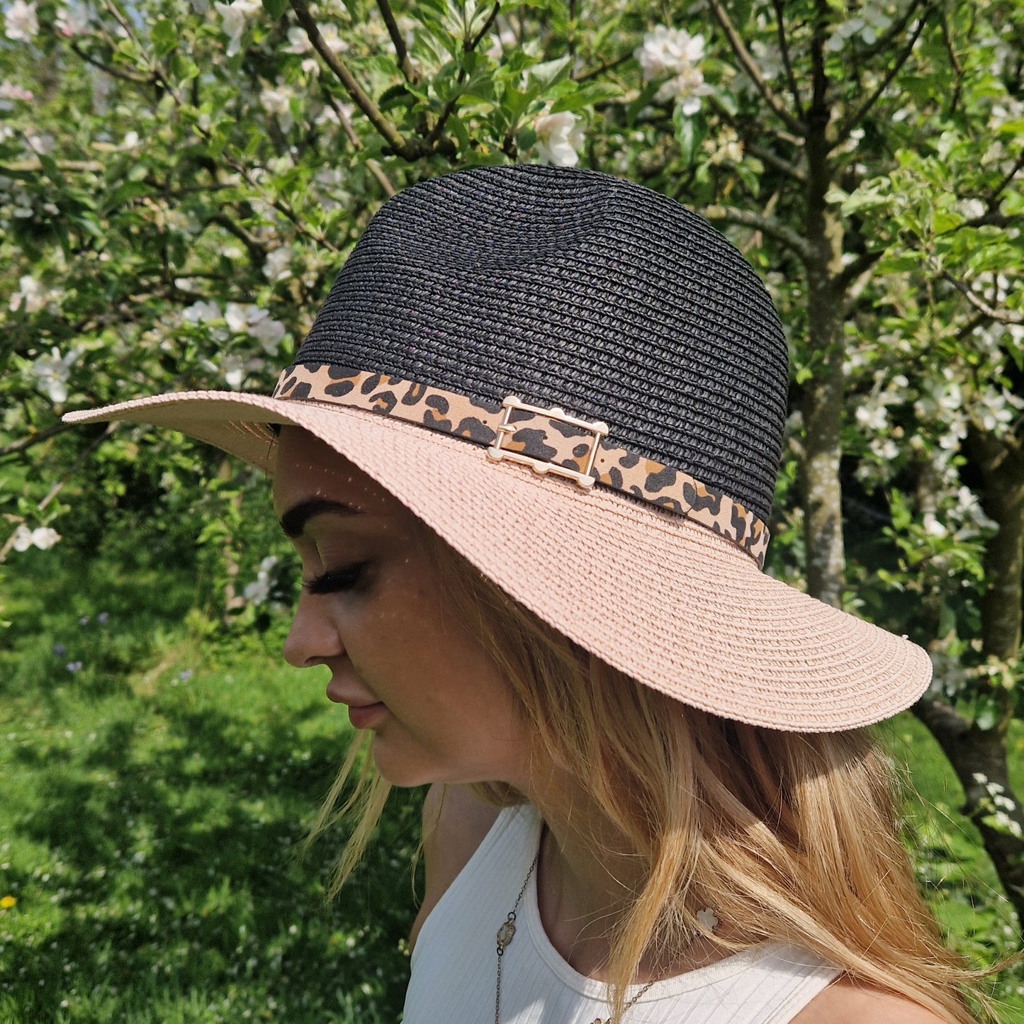 This classic Panama hat has a black top and a brim of pale pink. The hat is finished with a leopard print belted band.