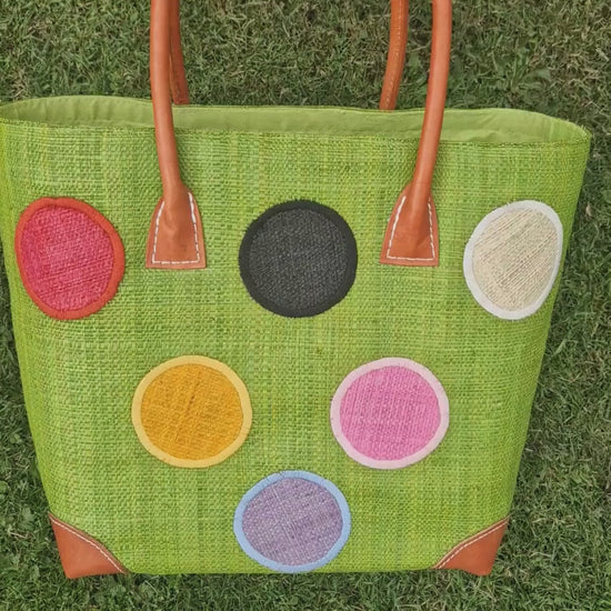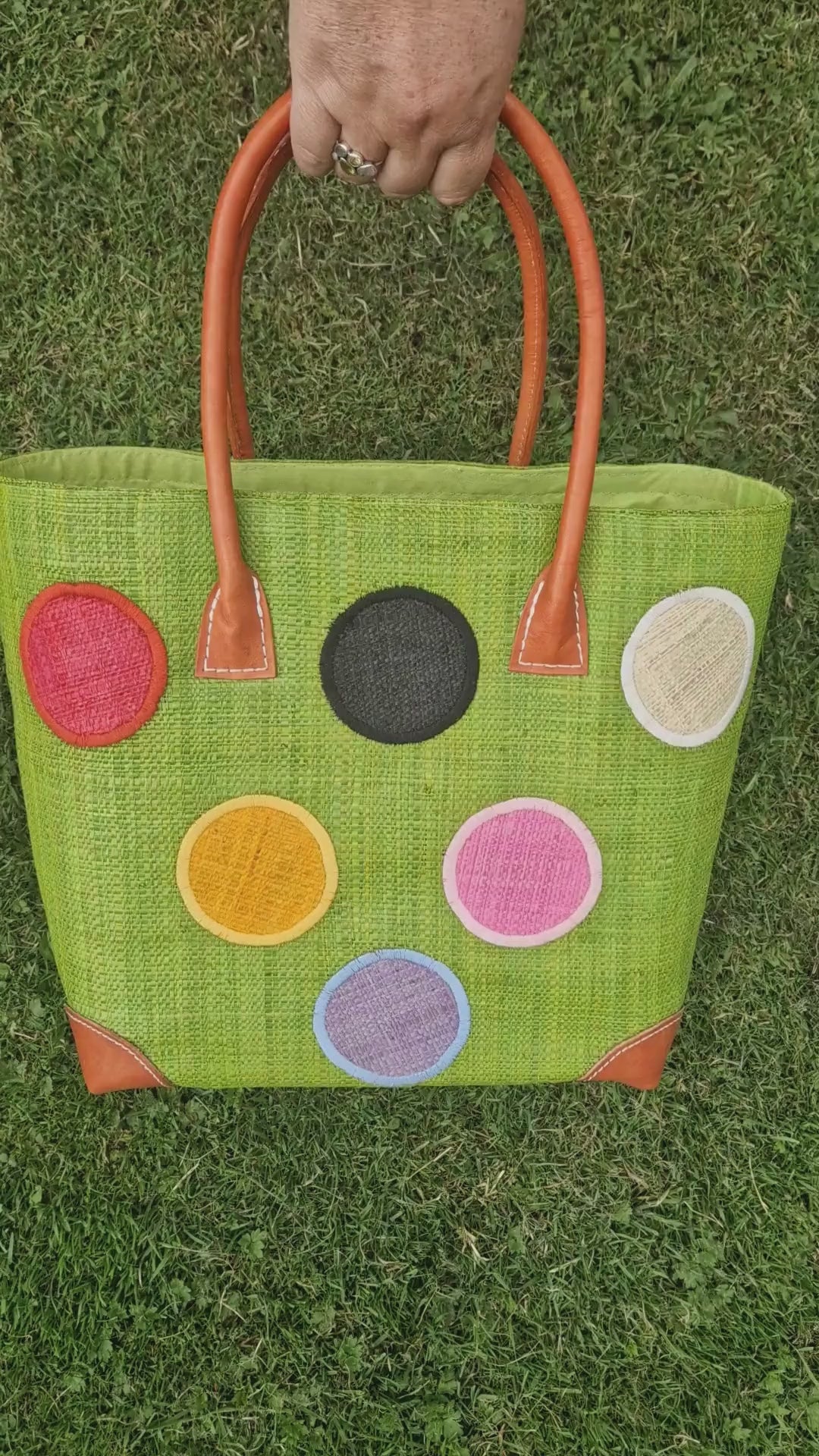 These baskets have a Raffia exterior in Lime Green and a rainbow of coloured spots front and back.
