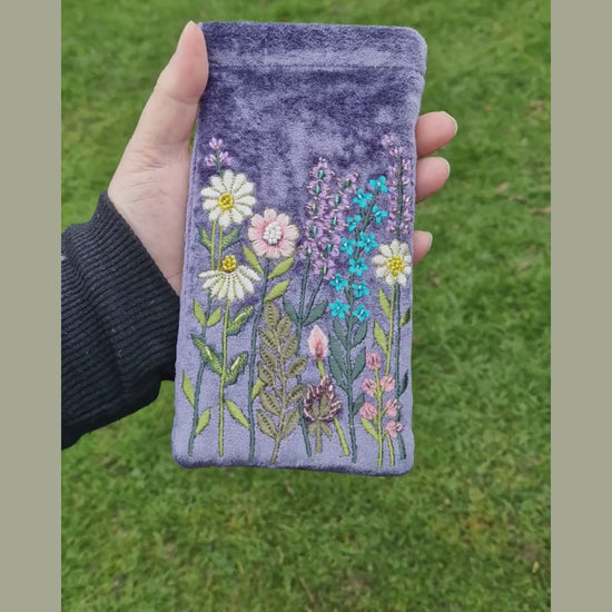 Soft Amethyst Purple Velvet Glasses Case with Embroidered Garden Flowers