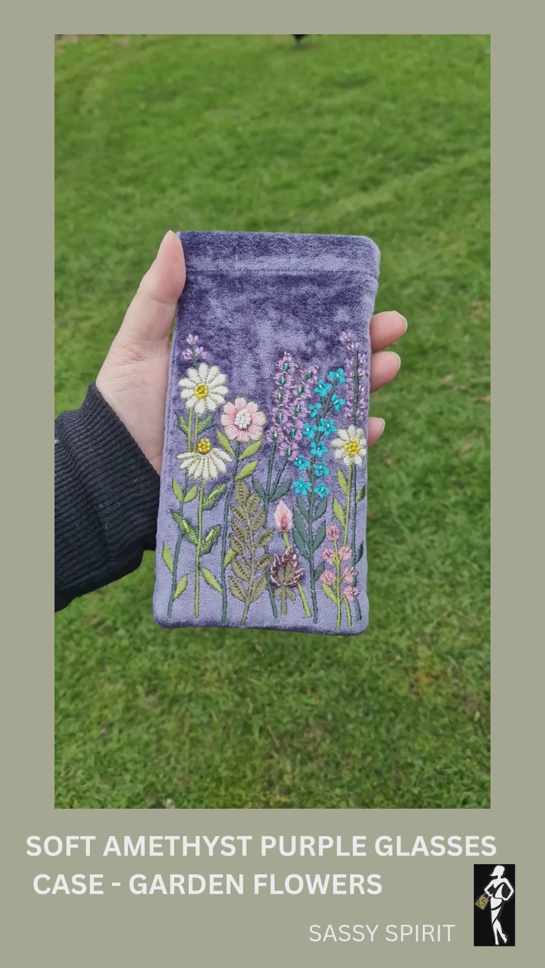 A beautifully made velvet glasses case designed to feel elegant, practical and quietly special. Set against a soft amethyst purple background, delicate garden flowers in pink and purple tones are intricately embroidered and finished with coordinating beads, creating a design that feels timeless and uplifting.