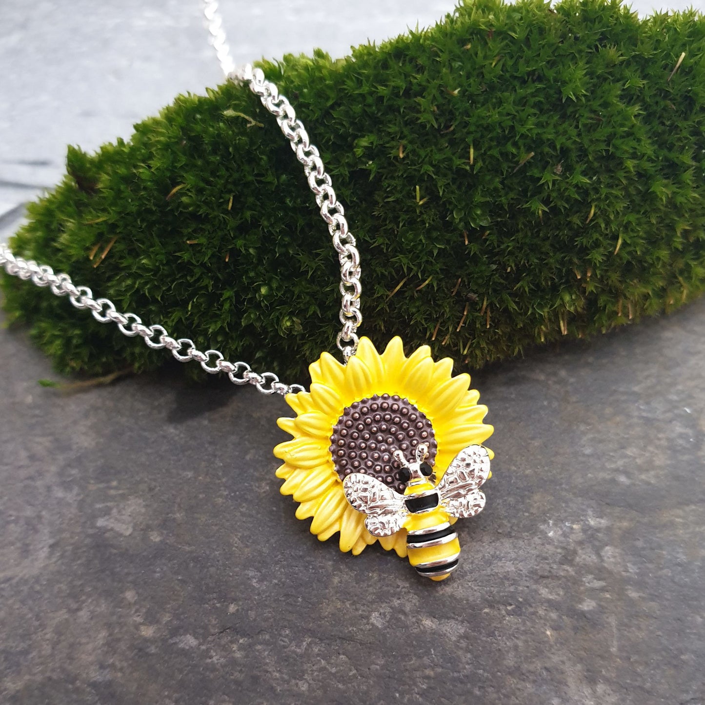 A superb Sunshine Yellow Sunflower is the focus of the lovely Pendant, enchantingly finished with a cheerful bumble bee.