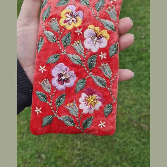 Sunset Salmon Velvet Glasses Case with Embroidered Pansy