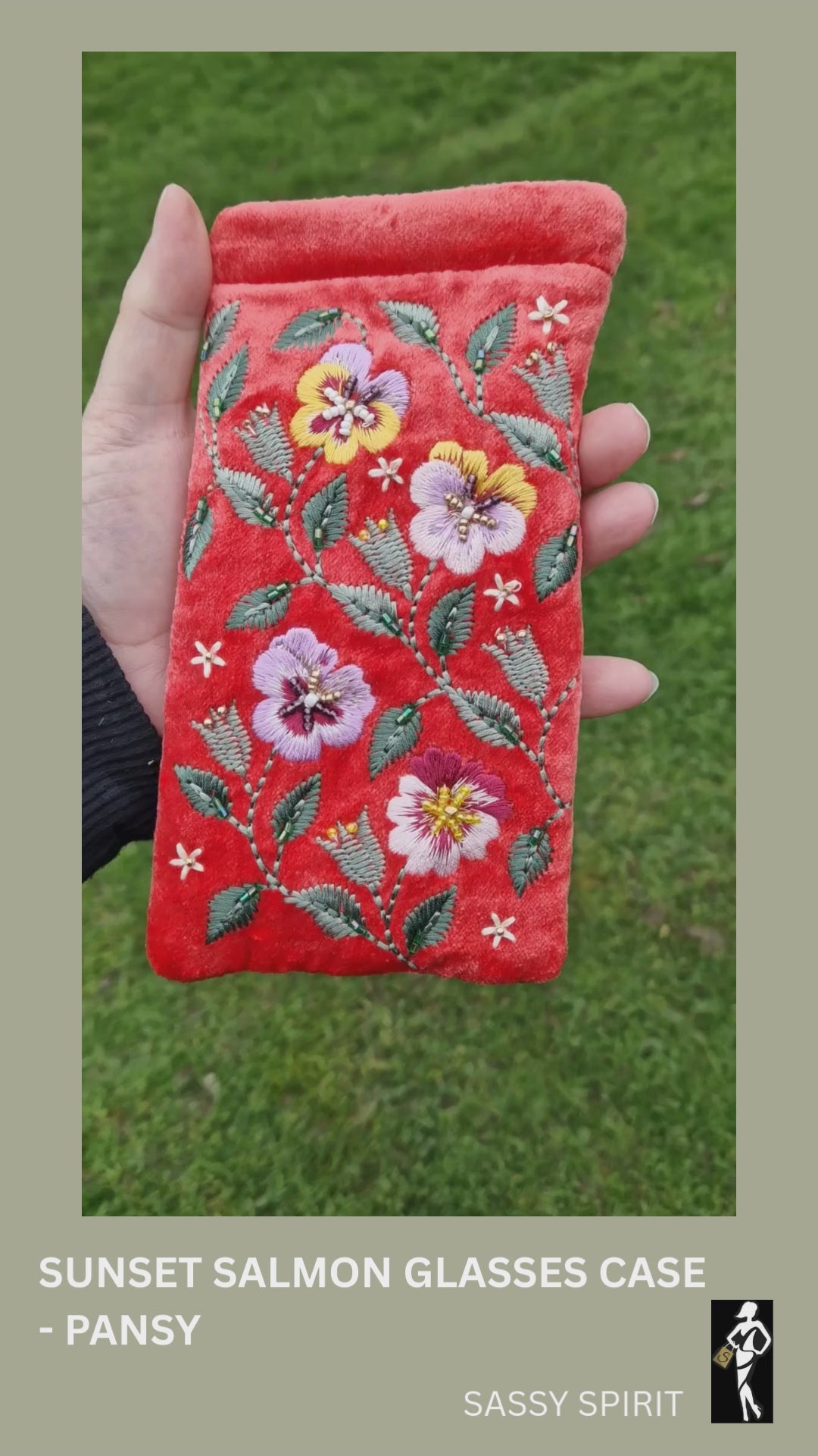 A beautifully crafted velvet glasses case designed to bring colour and character to everyday essentials. Made from rich sunset salmon velvet, this design features a striking embroidered pansy in purple and yellow, framed by fresh green leaves and finished with delicate white beading.