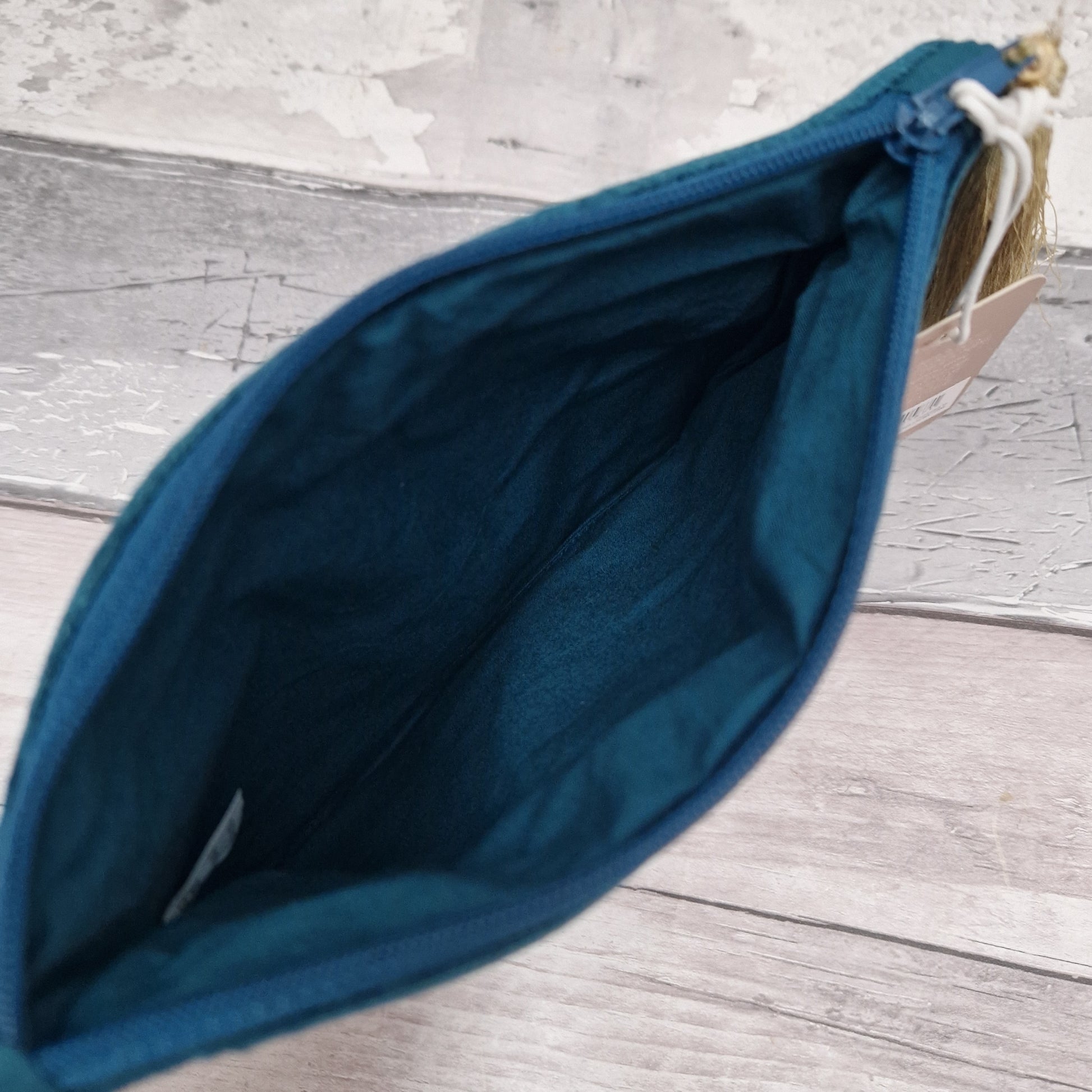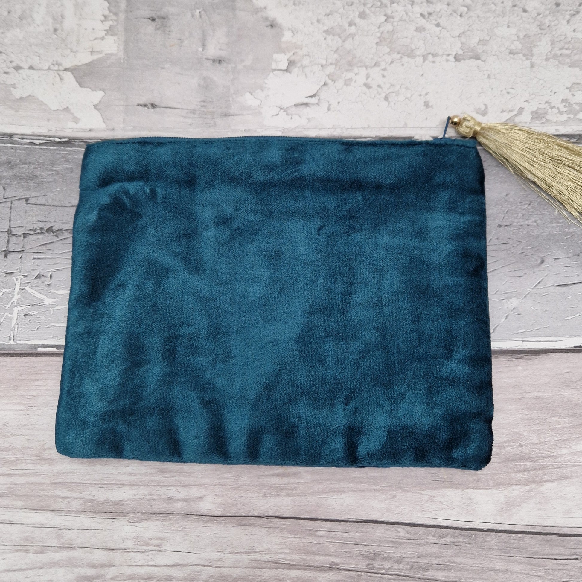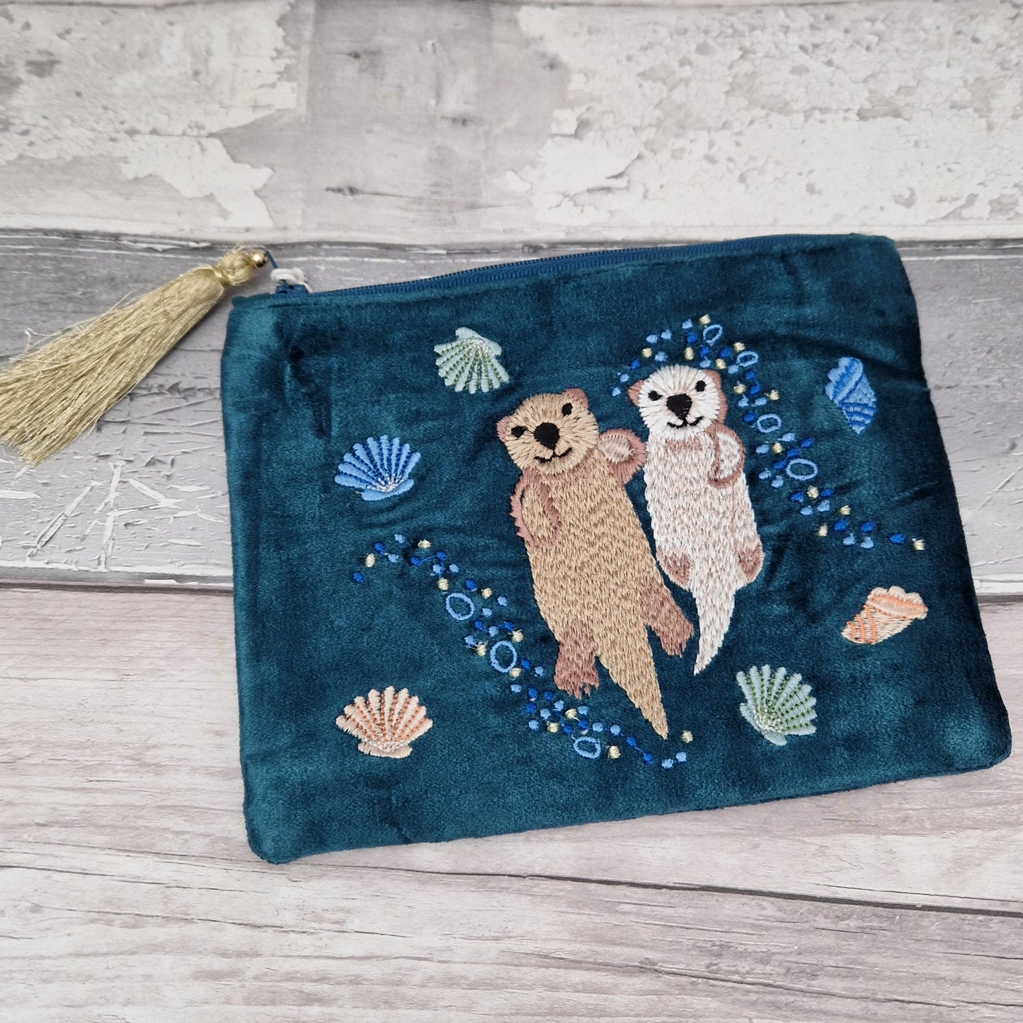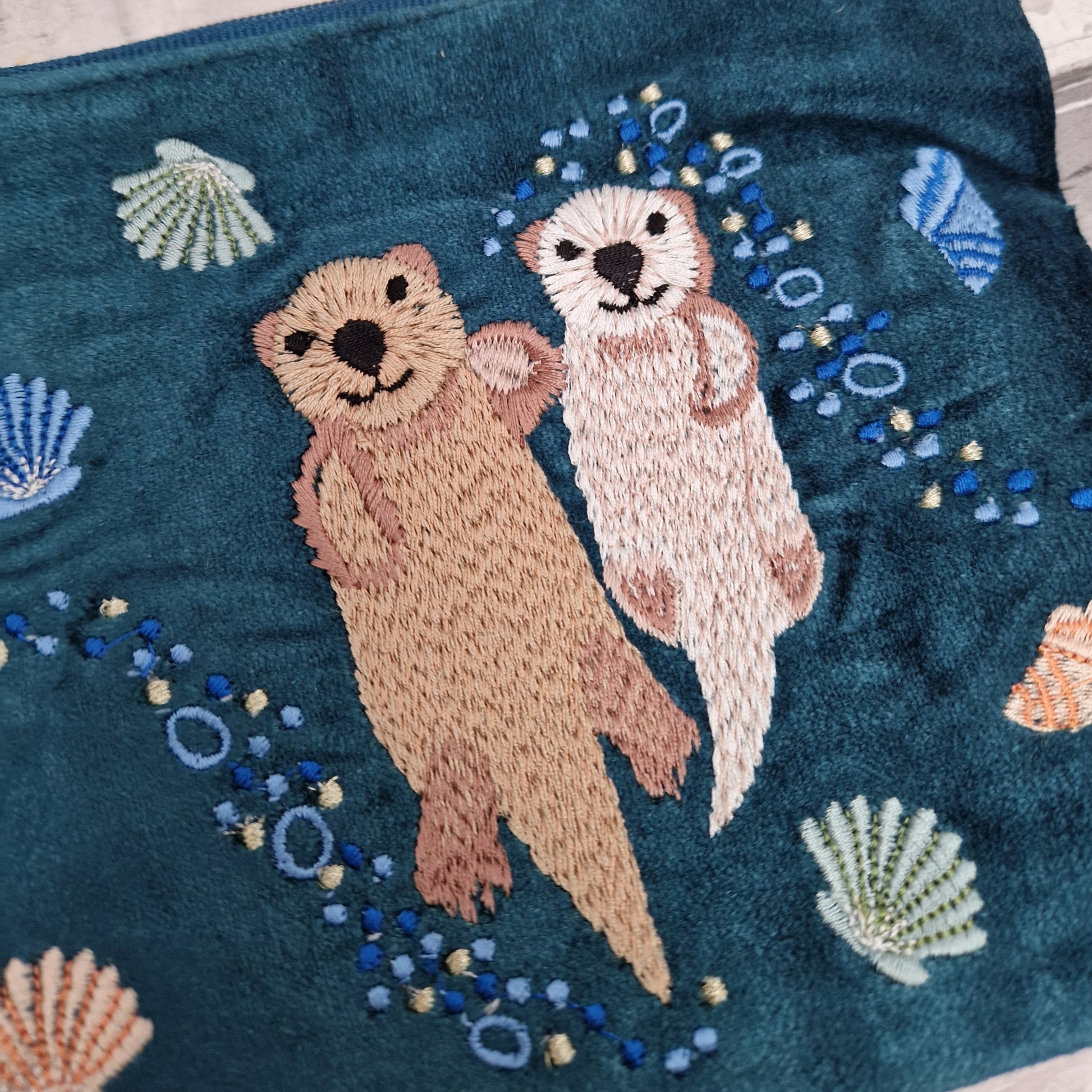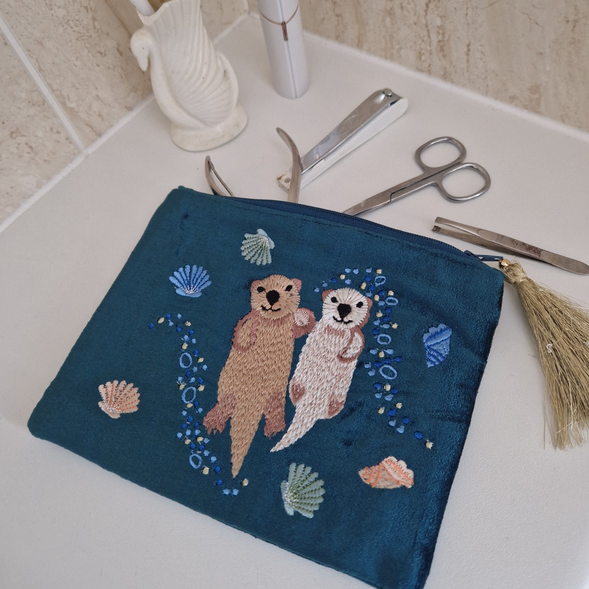 Embrace the beauty of the sea with this handcrafted turquoise velvet make-up pouch, featuring an intricate hand-embroidered design of a mother and baby otter floating serenely amidst delicate sea shells. The rich teal hue evokes the tranquil depths of the ocean, making this pouch a delightful addition to your collection.